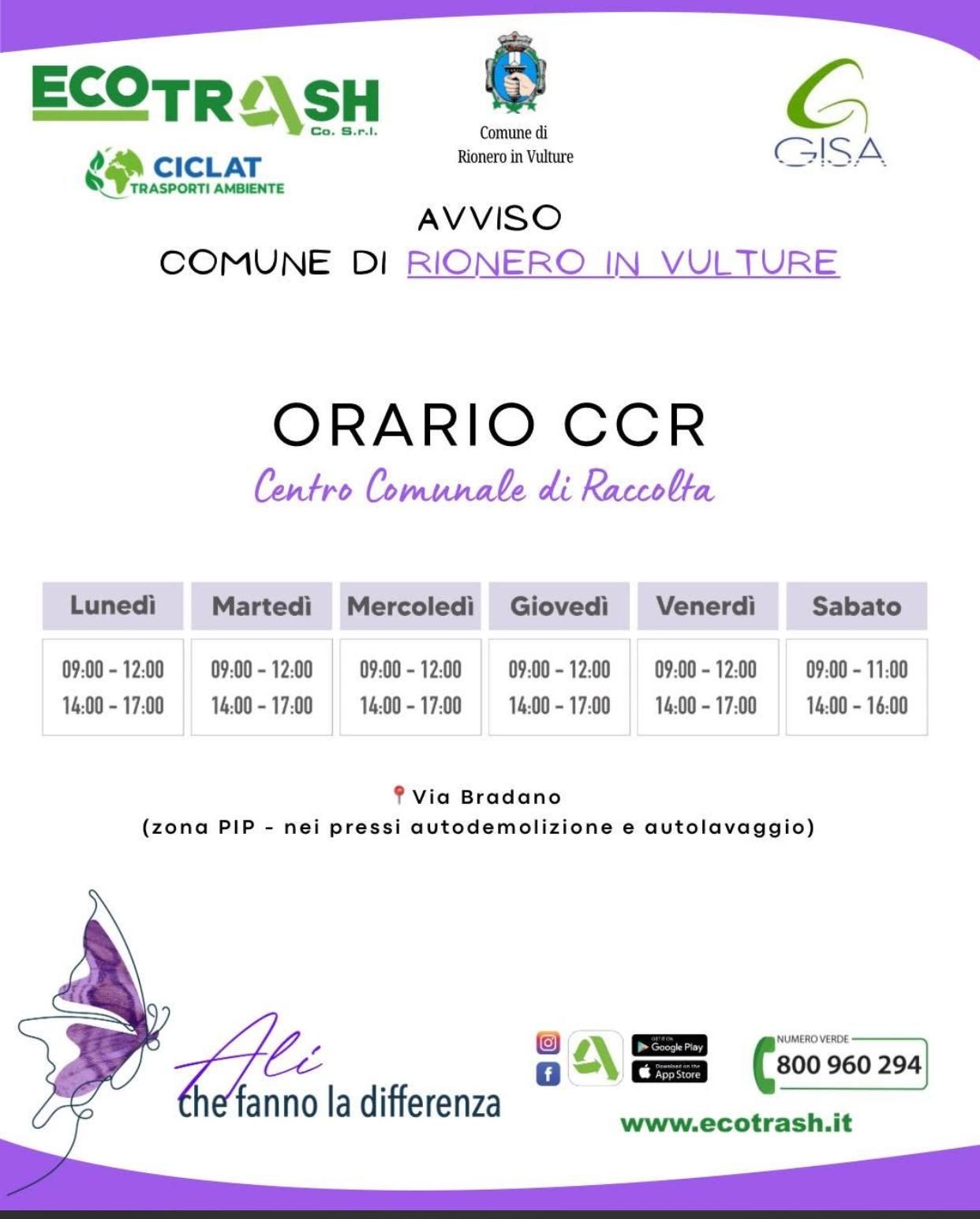 Si informa la cittadinanza che a partire da lunedì 2 febbraio sarà attivo il Centro Comunale di Raccolta (CCR) del Comune di Rionero in Vulture.